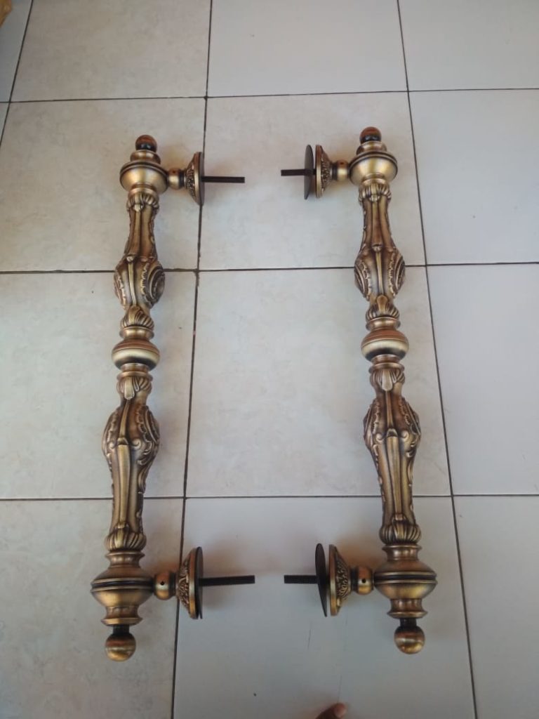 Handel pintu kuningan ukir yang elegan dengan gaya antik / Kuno. Cocok untuk ruangan yang artistik serta pintu besar elegan dengan gaya klasik. Material kuningan ukuran besar dan desain berkelas. Untuk setiap pembelian akan mendapat 2 unit atau 1 set untuk 1 pintu. Cocok untuk pintu utama atau pintu ukuran besar di Guest House, rumah kost ekslusif atau rumah pribadi.