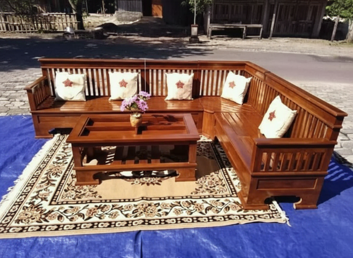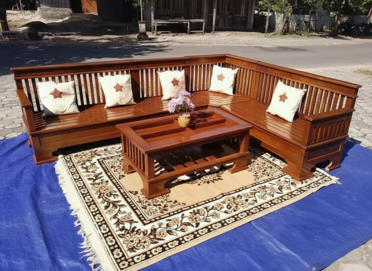 Kursi kayu sudut set dengan meja. Berdesain campuran klasik modern cocok untuk hampir semua haya interior. Setiap pembelian mendapatkan 2 kursi kayu panjang dengan 1 kursi sudut dan 1 meja. Kursi dirancang hanya memiliki sandaran tangan di ujung – ujung saja sehingga terasa lebih lapang. Bisa dilengkapi bantal atau aksesori lainnya bagi yang membutuhkan.