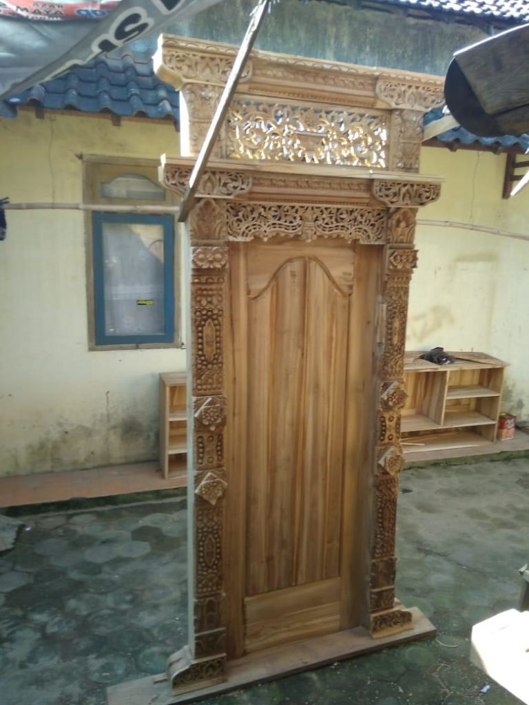 Pintu gebyok minimalis model Jepara atau ukir Kudusan. Bisa untuk pintu kamar guest house atau kamar pribadi. Pintu elegan dan klasik yang lebih baik daripada pintu kayu biasa. Harga, mulai Rp. 5.000.000 –