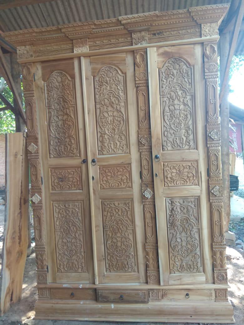 Pintu gebyok model 3 daun pintu yang lebar untuk pembatas ruangan yang lebar. Bisa dipergunakan di area bangunan komersial atau untuk area yang lalu lintas manusianya cukup banyak. Dibuat dari kayu berkualitas dengan detail ukiran yang indah.